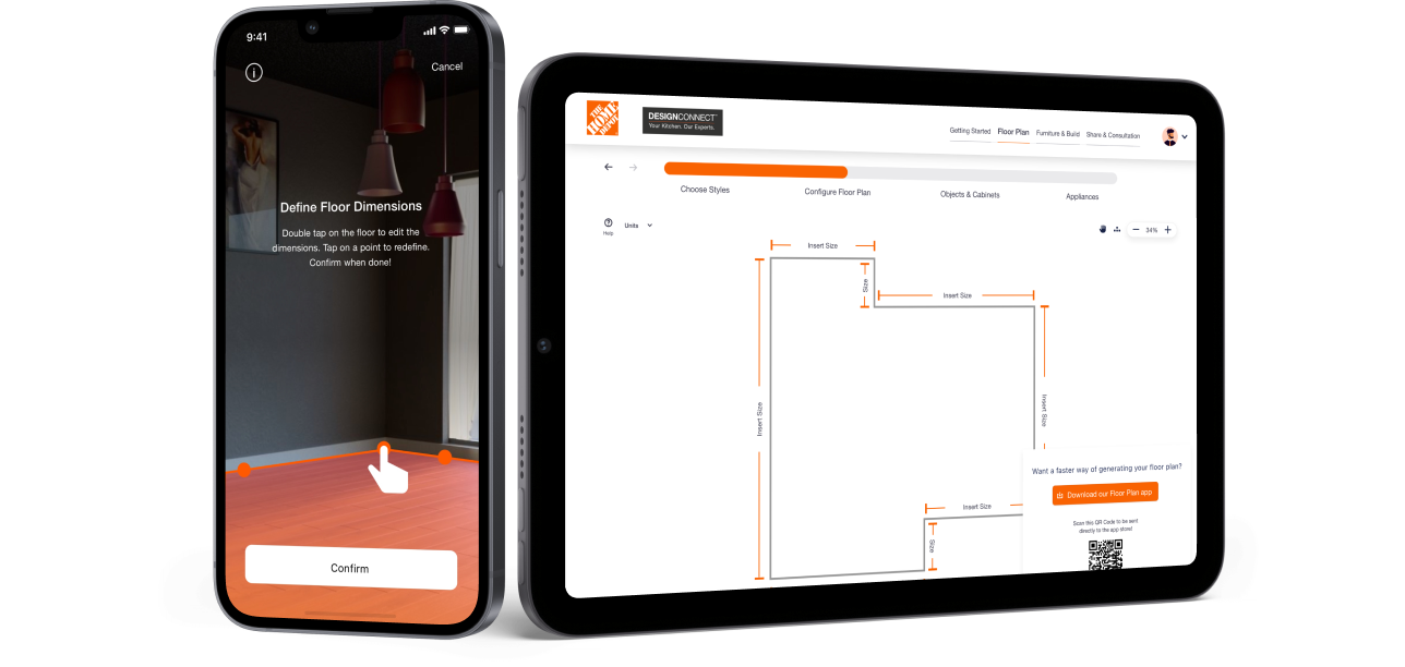 We wanted to leverage space-intelligent computer vision technology and user assist to accurately measure and replicate a customer's space. This would include placing doors, windows, appliances, and eventually sensing paint colors and room textures to improve data capture and recommendations. We incorporated AR technology to connect customers live with an Interior Designer, allowing them to view and adjust the room design and see new products in their own space.